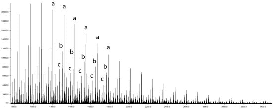 The MALDI-TOF technique allows for a deeper insight into the morphologies and microstructures of polymers. It allows for the confirmation of the mass of repeating unit and the residual mass related to the end group or core molecule. A detailed analysis of the structure of the obtained POXs was performed with this technique. An exemplary MALDI-TOF spectrum is shown in Figure 6. The distance between the a–a (b–b or c–c) peaks was equal to 116 m/z, which corresponds to a repeating unit of poly(3-ethyl-3-(hydroxymethyl)oxetane). All signals were observed as sodium cation adducts. The most intensive series a can be ascribed to the molecules with the TMP core. The b series m/z values were lower by 18 and can be ascribed to the macromolecules that contained one cyclic structure T’ formed via the dehydration of the terminal T structure and cyclization (Figure 1) [2]. As the reaction was quenched with ethanol, the c series came from POX macromolecule end-capped with ethoxy group. Other signals were in the minority and may have come from products of water elimination.
