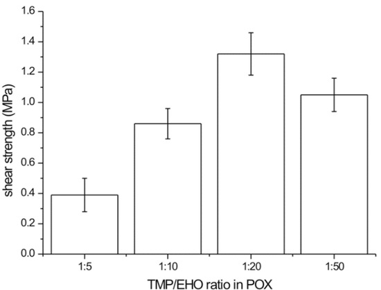 Thus, the studied POX-based adhesives seem plausible to be used where high mechanical properties of adhesives are not required, e.g., packaging or veneering applications.