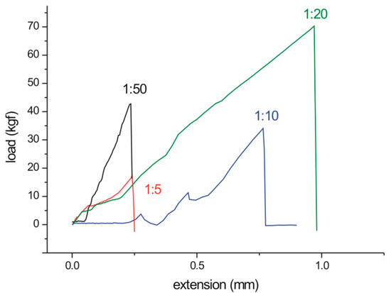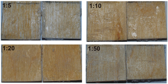 In order to empirically verify the hypothesis, the softening and flow points of the polymers were determined (Table 3). The Ts values were comparable to those of the commercial hot melt adhesives (88–105 °C) used in furniture manufacturing. Bonding experiments performed on birch veneers revealed apparent differences in joints shear strength (Figure 7). One can see that the POX 1:20 and 1:50 series exhibited much higher values (1.32 MPa and 1.05 MPa, respectively) than those of the 1:5 and 1:10 series (0.39 MPa and 0.86 MPa, respectively). The phenomenon is associated with both the abundancy of hydroxyl groups and the ability of hydrogen bond formation, which increases with the degree of branching as well as with the mechanical properties of POXs. Neither of them exhibited cohesive failures in wood, whereas cohesive failure in the POX layer was found in each case (Figure 8). Such behavior resulted from an adhesion to polar substrate that was higher than the cohesion within POXs. As shown in Figure 9, in all cases, a brittle fracture occurred at a low extension during the shear test (0.18–0.97 mm). It is known from the literature that brittle materials fracture under relatively low stress [48], and, moreover, the performance of high modulus adhesives on low modulus substrates is not optimal [49]. However, the brittle character of the investigated POXs cannot be associated with a highly crystalline structure since Mai et al. demonstrated that the degree of crystallinity decreases with increasing degree of branching in POX and is close to 0% for the degree of branching ca. 40% [11]. The highest extension to fracture was observed for the 1:20 POX, which indicates its abilities for higher deformation and stress dissipation than the other investigated POXs. Subsequently, the increased shear strength of the bond-line was yielded.