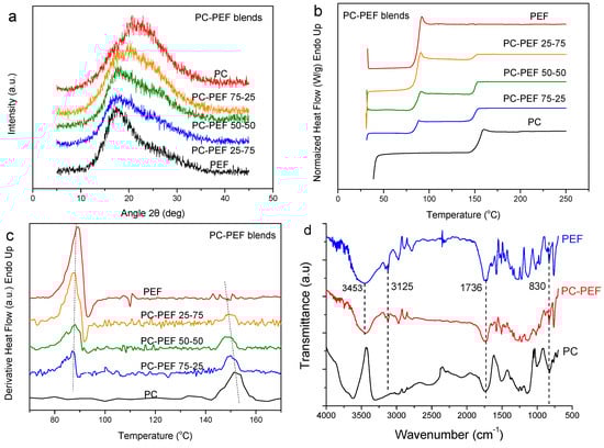 Another well-known high Tg polymer is polycarbonate. PC is an essentially amorphous polymer, as is revealed in Figure 2, and the respective WAXD pattern, for pure PC (Figure 2a). However, since PEF is also polyester of low crystallinity, the WAXD patterns of the PC–PEF blends remained amorphous, too. The DSC heating scans for the melt-quenched blend samples showed dual glass transition temperatures, and, in fact, there did not appear any real shift in the Tgs revealing that the polymers are completely immiscible (Figure 2b,c). From FTIR measurements, the blend retains characteristics of both polyesters, meaning the C=O stretching at 1736 cm−1 is the angular deformation of aromatic C–H at 830 cm−1, terminal hydroxyl groups at 3453 cm−1 and the characteristic 2,5-disubstituted furan heterocycles at 3125 cm−1 (Figure 2d).