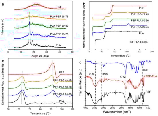 (a) WAXD patterns for as received PL–PEF blends, (b) DSC heating thermograms for melt- quenched PLA–PEF blend samples, (c) derivative heat flow for melt-quenched PLA–PEF blend samples and (d) FTIR spectra of neat PLA, PEF and their blends.