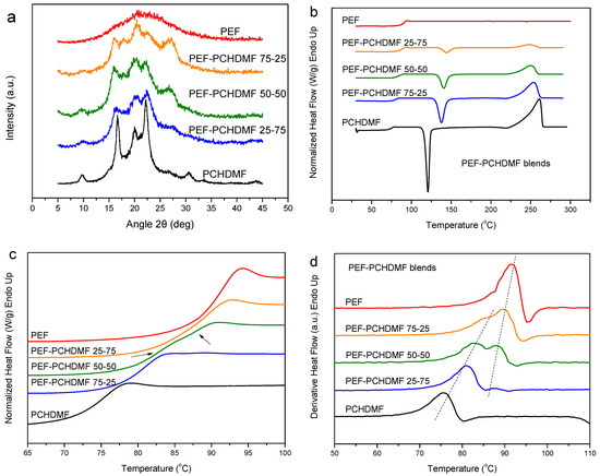 Previous works from our group focused on the study of blends of PEF with PPF or PBF [57,58,59,62]. It was found that the PPF–PEF blends show a single glass transition. Therefore, in this work, blends of PEF with poly(1,4-cyclohexane-dimethylene 2,5-furandicarboxylate) (PCHDMF), PCHDMF–PEF, were prepared and examined to get a better insight in all furan-based blends. The as prepared blends, like PCHDMF, showed some crystallinity, basically due to the PCHDMF component (Figure 4a). The solubility parameter values for PEF [δ = 22.5 (MJ/m3)1/2] and PCHDMF [δ = 21.6 (MJ/m3)1/2] are comparable but not the same (Table 1). Of course, these values have resulted from calculations based on the Van Krevelen’s approximation and are only indicative. The DSC heating scans for the melt-quenched PCHDMF–PEF blends showed rather a single Tg. To better study the situation, the enlarged scans in the glass transition temperature range of Figure 4c should be used or the derivative heat flow plots (Figure 4d). In both Figures, it is obvious there can be observed a shift in both Tgs. In the derivative heat flow plot for the 50-50 composition, dual glass transitions are still observed. The picture is not very clear in the other blend compositions. On this basis, the PCHDMF–PEF blends are not completely miscible. In addition, there exists indication of some homogenization.