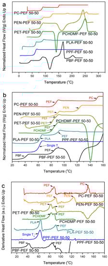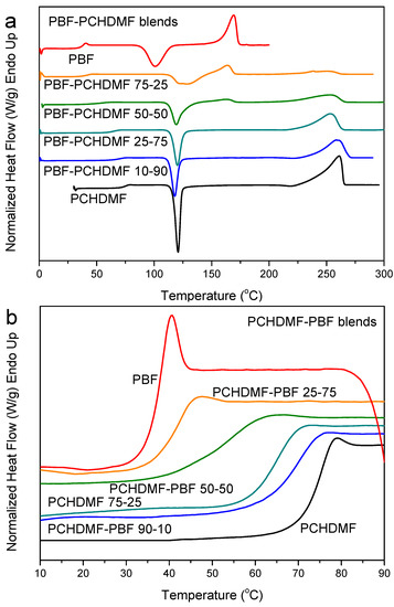 Finally, Figure 13 summarizes the DSC findings for quenched PBF blends. A single glass transition is observed for the PET–PBF 50-50 and PCHDMF–PBF 50-50. For PBN–PBF 50-50 and PBT–PBF 50-50, a single Tg can be observed; however, this is due to the fast crystallization of PBN and PBT respectively, so that the polymer pairs are phase separated due to crystallization. For PC–PBF 50-50, the glass transition for PC is just masked by the cold crystallization of PBF. In fact, PC and PBF polymers are not miscible and the Tg for PBF is unchanged.