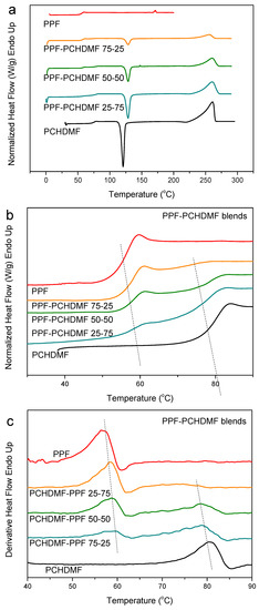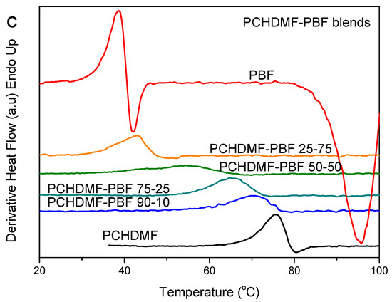To clarify the case and better understand the extent of miscibility and the effects of the small Tg difference for PCHDMF–PEF blends, the PCHDMF–PPF and PCHDMF–PBF blends were studied. In the DSC heating scans after melt-quenching, PCHDMF crystallized alone (Figure 8a). However, dual Tgs appeared as is well-observed in the magnified scans (Figure 8b) and the derivative heat flow plots (Figure 8c). A shift, however, to intermediate temperature values can be also observed, which is a sign for partial miscibility. The Tg for PCHDMF decreased by about 6 °C, while the Tg value for PPF increased by 4 °C. It is noted that the decrease in the value of the high Tg is always more pronounced than the increase in the low Tg value in the binary blends.