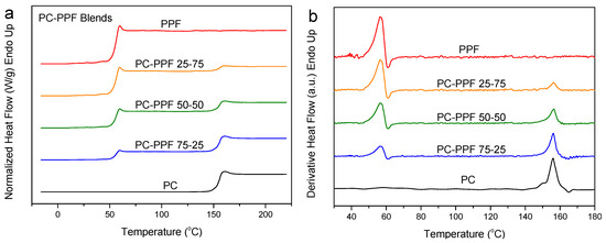 Figure 10a shows the results of the DSC scans concerning the PC–PPF blends. Figure 10b shows the derivative heat flow curves against temperature. Like PEF and PBF, PPF’s mixtures with PC show two distinct Tgs. In fact, there is no significant change in the Tg values of the two components in the blends. Thus, it can be assumed that PC–PPF blends are immiscible.