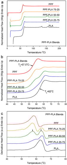 The case of PLA–PPF blends is studied in Figure 11. The Tg values for the neat polymers were 57.5 for PPF and 62 °C for PLA. So, the difference in Tg values is ΔTg = 4.5 °C. The DSC heating traces for melt-quenched PLA–PPF blends showed two distinct glass transitions (Figure 11a). The enlarged traces of Figure 11b and the derivative heat flow curves of Figure 11c clearly show the dual processes. It was proved that even at a fast heating rate of 20 °C/min, overlapping processes are well resolved, even though some enthalpy relaxation occurred.