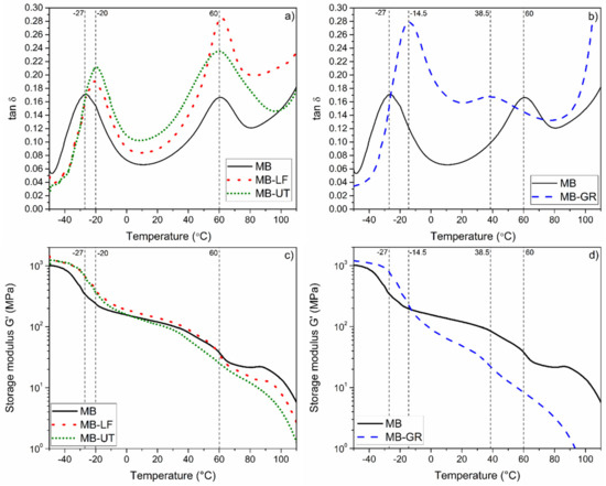 Figure 2c,d show the evolution with the temperature of the storage modulus (G’), for the studied materials. It can be seen that all the storage modulus of the formulations decrease when the temperature increases. Moreover, the main drops of the modulus of all the formulations take place in the same temperatures discussed above, which are attributed to the PBAT and starch phases of the MB, respectively. For temperatures below 0 °C, MB-LF, MB-UT, and MB-GR have higher G’ values than the MB, which is a consequence of the compatibility and interaction between the gum rosin derivatives and the components of the Mater-Bi type bioplastic. In contrast, for temperatures between 0 and 60 °C (Tg2), the storage modulus of the UT and GR added materials decreased compared to the MB. Meanwhile, for MB-LF the modulus remains slightly higher than the one for MB. This behavior is in good agreement with the results obtained in the mechanical characterization, and it is explained by the plasticizing and compatibilizing effect of the studied resins; the solubilizing and compatibilizing effect of the GR and UT; and the cohesive effect of LF.
