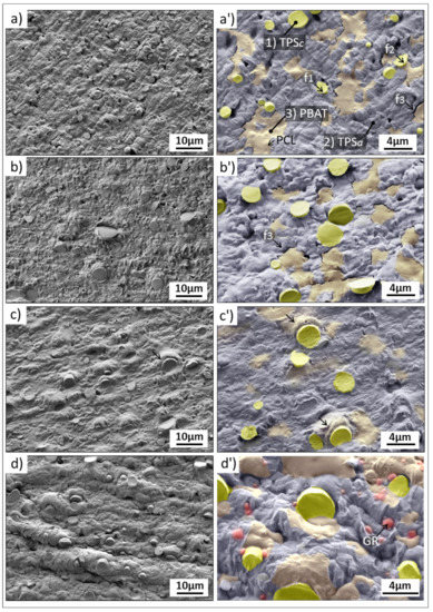 Moreover, Figure 3b,b’ show the microstructure of the MB-LF formulation. The microstructure obtained is very similar to that of MB supplied, clearly revealing the phases described above and the PBAT/TPSa miscibility failure, already discussed. However, there is a slight improvement in miscibility between the TPSc and TPSa phase due to the gum rosin derivate presence in this formulation (LF). This effect is confirmed not only by the absence of TPSc particles detached from the matrix phase but also because the TPSa phase shows good cohesion/wettability with the semi-crystalline phase TPSc. These results lead to consider that LF increases the miscibility between the semi-crystalline and the amorphous phases of thermoplastic starch (TPS), while the compatibility of TPS with the PBAT is not improved in this case. As a consequence, MB and MB-LF possess similar mechanical properties, as shown in Figure 1.
