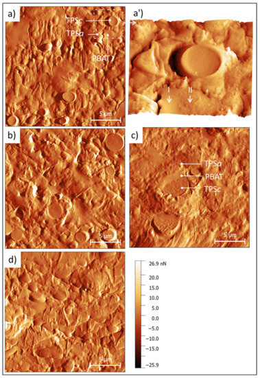 Additionally, the results of the elastic modulus of all the formulations are shown in Figure 5. From the analysis of the supplied MB (Figure 6a,a’) it was determined that the elastic modulus (E) of the TPSa phase (dark-colored matrix) was 2 GPa, while the TPSc particles showed an E value of 12 GPa. The PBAT phase showed the dispersion of E values between 12.5 and 17 GPa, resulting in the most rigid phase of all the components of the MB. The most rigid regions of the PBAT phase coincide with the areas where PCL particles are revealed. However, these particles are very thin and protrude from the surface, which can cause a poorly estimated contact area and therefore the E values may be overestimated. Future studies will be necessary to corroborate the stiffening effect of the PCL in the PBAT. From this analysis, it is understood that the TPSa matrix phase is about 30% less rigid than the PBAT and TPSc particles.