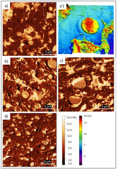 Elastic modulus map obtained by AFM-QNM of Mater-Bi® NF 866 (a,a’); Mater-Bi® NF 866 with Luerefor 125 resin (b), Mater-Bi® NF 866 with Unik Tack P100 resin (c), and Mater-Bi® NF 866 with gum rosin (d).