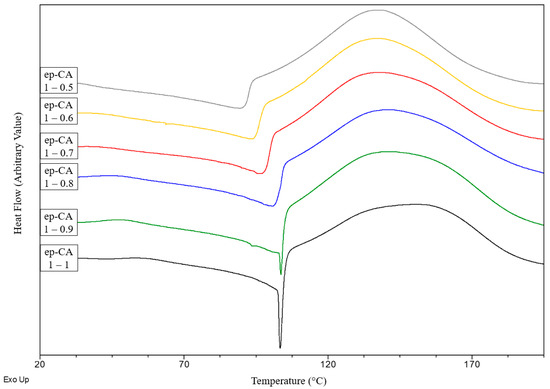 Thermograms of dynamic curing reaction of thermoset series with varying Epoxide function/CA ratios.