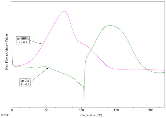 HHPA reacts with BioIgenox at a lower temperature than CA (see Figure 2), as it was previously reported by our team in the case of GEEpiE [21,22]. Not surprisingly, no endothermic fusion peak is observed at 100 °C on the DSC thermogram. It is noticeable that these moderate curing temperatures are consistent with usual composite processing including natural fibres.