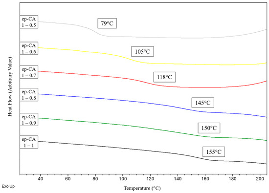The DSC curves for the BI/CA thermoset series obtained after 2 h of curing at 150 °C in oven, are shown in Figure 3 and their glass transition temperatures are reported in Table 2. As depicted in Figure 3, Tg significantly increases when epoxide function/CA varies from 1/0.5 to 1/0.8 while it remains quite constant for the 1/0.9 and 1/1 ratios. For the most crosslinked systems, Tg cannot be accurately determined using DSC because the change of the Cp value associated to Tg is not well pronounced. It is well known that DMA is more sensitive to the changes occurring at the Tg when compared to DSC [26,27]. Thus, DMA results were also exploited to determine the Tg values (Figure 4). Three different methods were used for the Tg determination from the DMA results, i.e., the maximum value of the E′ curve derivative, the peak of the E″ curve and the peak of the tan(δ) curve. These values, synthetized in Table 2 were determined from the raw data without any interpolation.