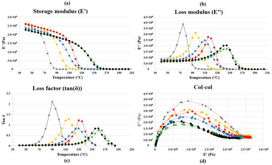 Storage modulus (a), loss modulus (b), loss factor (c) and Cole–Cole diagram (d) for ep/CA/DMIA (1/X/0.025) formulation with X = 1 (black), 0.9 (green), 0.8 (blue), 0.7 (red), 0.6 (yellow), 0.5 (grey).