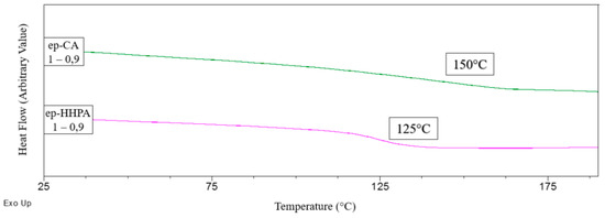 In order to extend the panel of materials available from BioIgenox, this bio-based resin has also been cured with HHPA, using the best epoxide function/anhydride molar ratio previously determined with CA hardener. The mechanical and thermal characteristics of this resulting thermoset have been compared with those obtained with the formulation involving CA hardener. DSC thermograms of both cured thermosets are depicted in Figure 6 and the mechanical properties as well as the crosslinking density values of these formulations are given in Table 5.