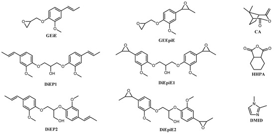 Dichloromethane (DCM, analytical grade, Carlo Erba, Barcelona, Spain), acetone (analytical grade, Carlo Erba, Italy), sodium hydrogen carbonate (NaHCO3, ≥95% purity, Sigma-Aldrich, St. Louis, MO, USA), tetrabutylammonium hydrogen sulfate (Bu4NHSO4, ≥97% purity, Fluka, Chemie, GmbH, Buchs, Switzerland), epichlorohydrine (99% purity, Sigma-Aldrich), and Oxone® (Sigma-Aldrich) were purchased and used as received. Natural isoeugenol (Sigma-Aldrich, 99%), diglycidyl ether of bisphenol A (DGEBA, Sigma-Aldrich, Steinheim, Germany), camphoric anhydride (CA, 98% purity, Alfa Aesar, Ward Hill, MA, USA), hexahydrophtalic anhydride (HHPA, 95% purity, Sigma-Aldrich) and 1,2-dimethylimidazole (DMID, 95% purity, Sigma-Aldrich) were purchased and used without any further purification. These reagents are depicted in Scheme 1.