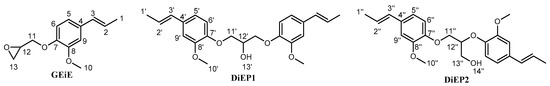 DiEP1 and DiEP2 were isolated from the BioIgenol mixture by chromatography column. 1H NMR, 13C {1H} NMR, mass spectrometry, and elemental analysis have confirmed the formation of the dimers DiEP1 and DiEP2. In particular, 13C {1H} NMR shows five different signals attributed to the glycerol chain carbons (C11′, C12′ in DiEP1 and C11″, C12″, C13″ in DiEP2). As expected, the mass spectrum is in accordance with DiEP1 and DiEP2 structures (calculated 407.183, found: 407.181). It is noteworthy that DiEP1 and DiEP2 were not separated by a chromatography column.