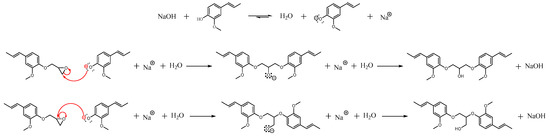 The reaction of isoeugenol with epichlorohydrin leads, as expected, to glycidyl ether isoeugenol [21]. Two by-products, DiEP1 and DiEP2, are also formed according to the reaction mechanism shown in Scheme 5.
