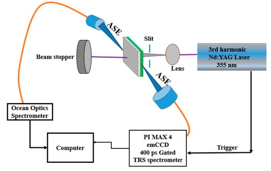 The CO BECV-DHF was purchased from American Dye Source, Inc. (Quebec, QC, Canada) and had a molecular weight of 773.12 g mol−1 with a molecular structure, as shown in Figure 1. Laboratory-grade solvents such as chloroform were purchased from Sigma Aldrich, St. Louis, MO, United States. A Perkin Elmer Lambda 950 spectrophotometer (Llantrisant, United Kingdom) was used to record the absorption spectra over a wide range (200–1000 nm). The fluorescence spectra were measured using a spectrofluorometer (LS 55, from the same company) over a scan range of 200 to 1000 mm []. The laser pulse (a 5 ns laser of 3rd harmonic (355 nm) from Nd:YAG) (Brilliant B, Quantel, Les Ulis, France) was focused by a cylindrical lens with a 5 cm focal length and fixed horizontally; therefore, the laser pulse was concentrated to a strip of 1 mm × 1 cm (length × width), as shown in Figure 2. The thin film samples were placed away from the focal point to avoid laser ablation of the active media. The samples produced LIF or ASE based on the pump energy, which was collected using fiber optic cables at both sides. One fiber was connected to the Ocean optics spectrograph with a wide range of 200 to 1100 nm (Maybachstrasse, Ostfildern, Germany), and another was connected to the PI. MAX 4 ultrafast-gated emCCD ultra cooled camera, with an Acton spectrograph (Princeton Instruments, Trenton, NJ, USA), which had a gate of less than 400 ps.