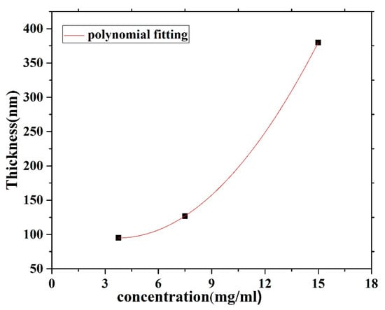 Film thickness versus the solution concentration for CO BEVC-DHF deposited by spin coating at 2000 rpm.