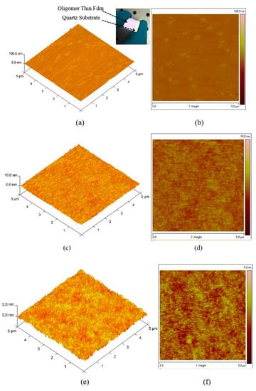 Atomic force microscopy (AFM) images of the oligomer at thicknesses of 270, 88, and 70 nm. (a,c,e) are 3D surface of film with thickness 270, 88 and 70 nm, similarly (b,d,f) are 2D morphology of film with thickness 270, 88 and 70 nm respectively.