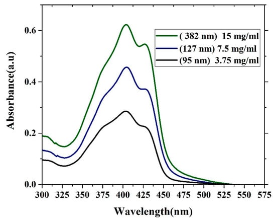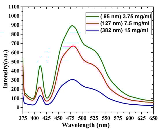 Figure 10 shows laser-induced fluorescence spectra with three distinct peaks at 425, 455 and 485 nm along with one shoulder at approximately 525 nm. The FWHM of the LIF was at 67.3 nm. The deconvolution of the LIF spectra exhibits four peaks, as shown in Figure 10. The first peak (A) at 425 nm is due V0 shifted, the second peak at 455 nm corresponds to V1 and the 485 nm is V2 peak, at approximately 496 nm. The aggregation peak which due to the dimer and the tail peak is located at approximately 520 nm, which is due to the reabsorption of all bands such as (A), (B) and (C) in Figure 10; therefore, it has a large overlap from all deconvoluted bands.