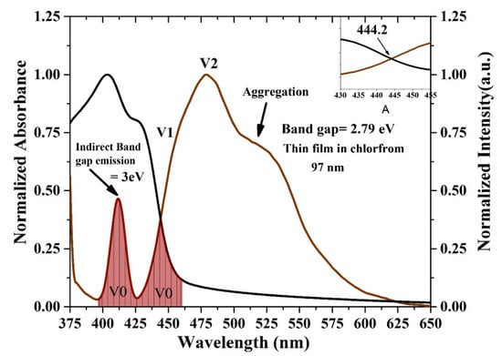 The oligomer showed that an increase in the thickness reduces the transmission. The energy gaps (Eg) of the CO were obtained according to the following relation (Eg = hc/λmax), where h is Planck’s constant, c is the light speed, and λmax is the wavelength in the maxima of the derivative curve. The sharp peak at λ = 445 nm indicates that Eg = 2.78 eV, which is directly attributed to the vibration transition S0-S1 (V1) of the monomer as shown Figure 8. The band gap shifts a small amount toward red when the thickness is reduced. Another minor peak at approximately λ = 413 nm was due to the transmission between S0-S0 (indirect band gap), which is the overlapped vibration band (V0, electronic state 0-0) of the monomer with approximately Eg = 3 eV. Furthermore, no band is shown in the longer wavelength region; however, there is a long tail, which indicates aggregation in the ground state. Although new peaks appeared in the first-order derivatives of the transmission concerning the wavelength (dT/dλ) spectra at 413 nm, the band gap is considered to be 445 nm because it is in the longer wavelength region beyond which there is no absorption or transmission peak due to electronic transitions. Therefore, the peak at approximately 445 nm is not chosen because it has a higher amplitude. It is also possible to find the Eg of the CO films by crossing the absorption and fluorescence spectra as shown in Figure 9. The peak at 413 nm in the shorter wavelength region was also compared to the intersection of the fluorescence and absorption spectra, which is the indirect band gap due to the overlap as presented in Figure 8. The results revels that the band gaps are almost the same.