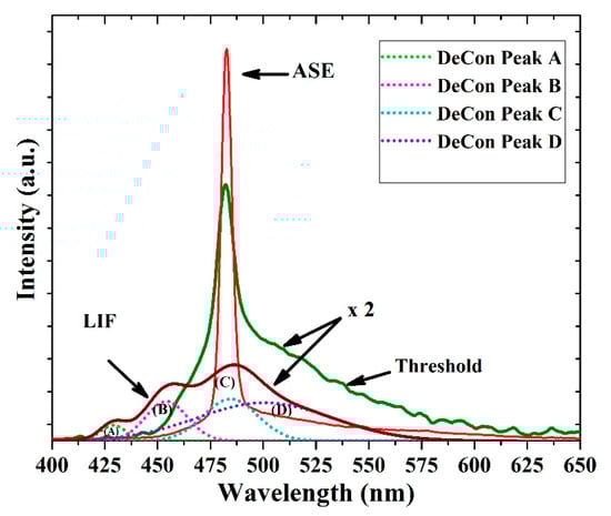 Amplified spontaneous emission (ASE), threshold, and laser-induced fluorescence (LIF) spectra of the CO film with a thickness of 380 nm and a concentration of 15 mg/mL. The Figure 10 also shows deconvolution (DeCon) of LIF spectra, where the light green (A), Pink (B), sky blue (C) and violet (D) bands are ascribed to V0, V1, V2 and dimer bands.
