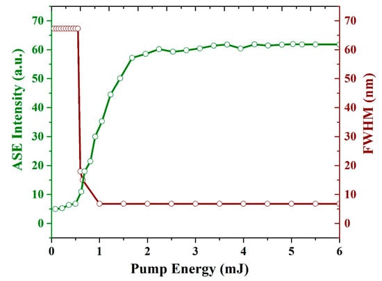 Figure 11 illustrates the spectral narrowing (FWHM) and ASE intensity as a function of the pump energy. The threshold of the CO film is 0.65 mJ. The intensity starts increasing, and more importantly, the FWHM of the spectrum is reduced from 67 to 15 nm. As the pump energy increased further to 1.1 mJ, the FWHM reached 6.8 nm, and the ASE intensity increased up to the saturation level of the detector as the pump energy increased beyond 5 mJ.