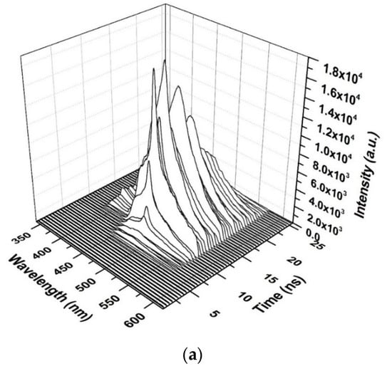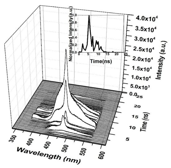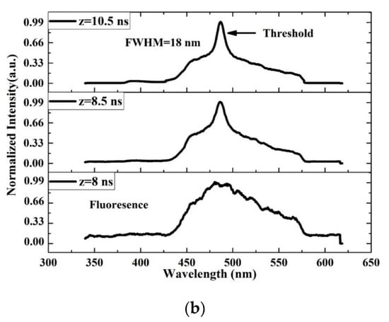 The TRS of the threshold pumping is shown in Figure 13. The pump energy is 0.65 mJ, and the threshold ASE occurred at 10.5 ns. The LIF is a broad band with ASE emerging on its top, where the LIF peak is approximately 482 nm. The important events are given in Figure 13b. The results show that at 8 ns, the LIF appears and starts narrowing at 8.5 ns, and at 10 ns, the threshold of ASE takes place with an FWHM of 18 nm and more intensity.