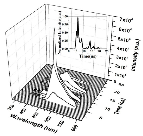 When the CO thin film was pumped at a 3 mJ pulse energy, the TRS spectra of the ASE were recorded, as displayed in Figure 14. Therefore, the ASE starts after 1 ns of the LIF, and the pulse of the ASE is very short. The saturation of absorption occurs at 5 ns, and therefore the ASE pulse is produced after 5 ns, at a very low intensity. This finding is compared to the peak intensity shown in the inset of Figure 14. The ASE is at the top of the LIF because of spectral broadening due to the reabsorption of the emitted ASE.