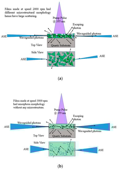 The ASE produced from these films depend on the morphology, the film with thickness 380 nm made from 2000 rpm spinning had microstructures and defects as shown in SEM images Figure 5 due to which they have good stability and produce ASE due to waveguiding in the microstructures as shown in Figure 17a. However, for 3000 rpm, the films become amorphous; they produce ASE, but have low photochemical stability when compared to 2000 rpm made films as presented in Figure 17b.