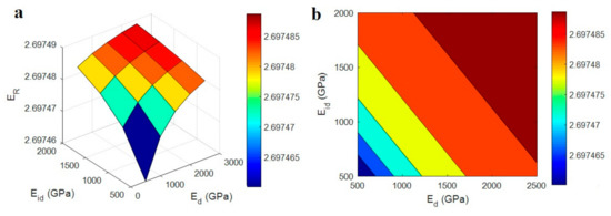 The influences of “Ed” and “Eid” parameters on the predicted modulus (Equation (10)): (a) 3D and (b) contour designs.
