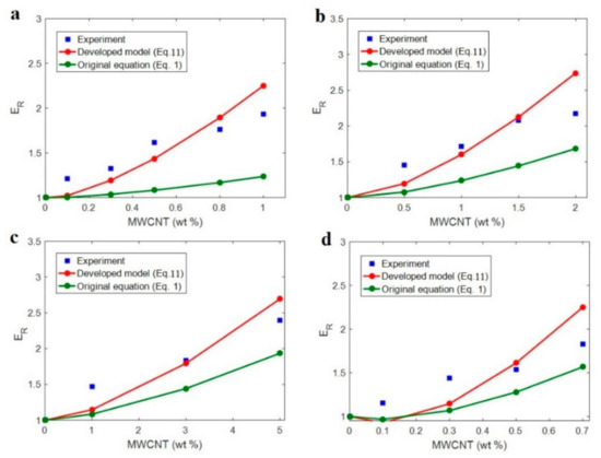 The experimental data of relative modulus and the calculations of original and developed models for (a) chitosan/MWCNT [45], (b) PP/MWCNT [46], (c) PVA/MWCNT [47] and (d) epoxy/MWCNT [17] samples.