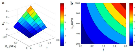 The effects of “f” and “EN” parameters on the relative modulus (Equation (11)): (a) 3D and (b) contour plots.
