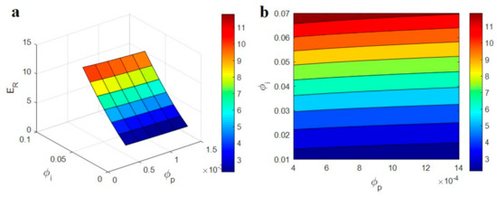 (a) 3D and (b) contour plots for the effects of “ ” and “” parameters on the relative modulus.