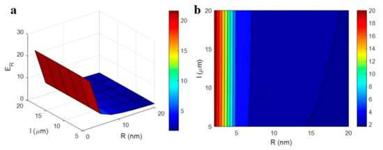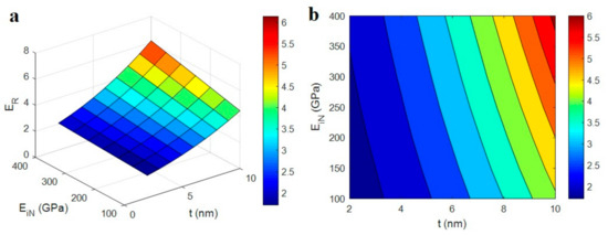The relative modulus of PCNT as a function of “t” and “EiN” parameters at = 0.01, Em = 2 GPa, R = 10 nm, l = 10 μm, Ed = 1000 GPa and EN = 500 GPa is observed in Figure 5. The smallest “ER” as 1.7 is shown at t = 2 nm and EiN < 340 GPa, while the highest relative modulus as 6 is obtained at the highest t = 10 nm and EiN = 400 GPa. As a result, a thin and poor interphase decreases the modulus of nanocomposites, but a thick and strong interphase increases the nanocomposite modulus to the highest level. It is concluded that the modulus of PCNT directly depends on “t” and “EiN” parameters. From the reinforcing view, a thick interphase is derived from a strong interfacial interaction/adhesion between polymer matrix and nanoparticles, which effectively transfers the stress from polymer matrix to nanoparticles, thus improving the modulus [48,51].