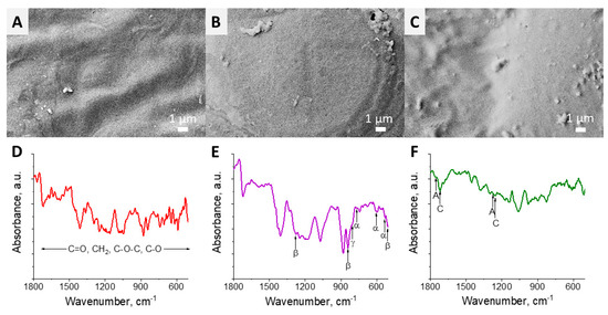 SEM images (upper line) and FTIR spectra (bottom line) of polymer films: (A,D) polycaprolactone (PCL), (B,E) poly(vinylidene fluoride) (PVDF) and (C,F) poly[(R)3-hydroxybutyrate] (PHB).
