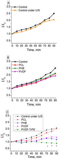 The analysis revealed that the bacterial growth rate was slightly slower when U/S was applied to E. coli in comparison with the control (Figure 3A). It can be seen that the polymer films are non-toxic for bacteria at the static mechanical conditions (Figure 3B). In turn, a significant statistic effect of the piezoelectricity on E. coli was observed (Figure 3C) after 60 min of piezoelectric effect stimulation by U/S, thus resulting in inhibition of the growth of bacteria. However, the decrease of the average optical density (and I/I0 ratio, where I0 represented the OD600 obtained at the beginning of the experiments and I represented the OD600 at a particular day it was measured) of bacteria media already appeared after 40 min of PHB, PVDF and PVDF-TrFE piezoelectric films treated with U/S. As it is mentioned above, the mechanism of the bacteriostatic effect for piezoelectric polymer films is likely connected with the generation of ROS groups [12,13]. However, the piezo-catalysis can even result in bactericidal effect (i.e., killing bacteria), as it was demonstrated with piezo-ceramics [12,13] due to significantly better piezoelectric properties of ceramics compared to polymers [11]. Piezoelectric properties of polymers can be further improved by poling, doping with piezo-inorganic and conductive fillers [14], thus providing enhanced bacteriostatic or even bactericidal effects.