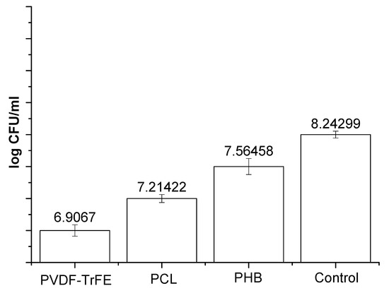 The effect of ultrasound treatment on piezoelectric materials immersed in a bacterial suspension leads to a significant decrease in the concentration of bacterial cells (Figure 4). In this study, we found the decrease of the number of bacteria with the presence of the piezoelectric polymer films. The maximum difference was revealed for bacteria in the medium containing a piezoelectric PVDF-TrFE film. The calculated I/I0 ratio (Figure 3) directly correlates with the data obtained using the bacteriological method (Figure 4).