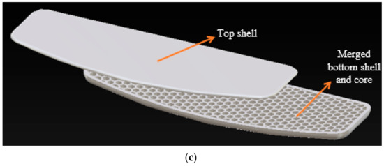 Modern boards are primarily composed of an inner foam core covered by a thin outer shell, generally called a sandwich structure [6,9]. The foam core enables reduced weight, increased buoyancy, and better stability for the rider, whilst the sandwich structure provides improved bending resistance. Such structures are mainly composed of three main parts: a top shell, a lightweight core, and a bottom shell [24]. The board in this study, however, was comprised of two primary parts, a top shell, and a merged bottom shell and lightweight core, which can be designed and 3D-printed with different patterns. Furthermore, most boards are manufactured with a bottom curvature that aims at better edging and upwind ability, which is significant for beginners, providing more grip and stability when compared to flat boards [25].
