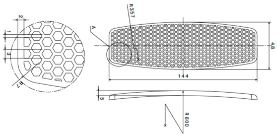 A smaller scale version of a real on-water sports board was designed. The dimensions of the designed merged bottom shell and the honeycomb core board are presented in Figure 2. The board had a 48 mm width and 144 mm length with a 357 mm radius curvature at two sides. A bottom curvature of 600 mm was considered, resulting in a model closer to the real one. The hexagonal honeycomb structure formed the core of the board, and was repeated across the specimen. As can be seen in the detailed view, the 3 mm wide honeycombs were patterned with 1 mm thick walls. Moreover, the bottom and top shells of the board had thicknesses of 5 and 1.5 mm, respectively.