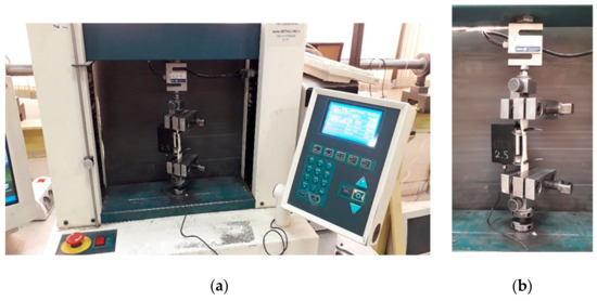 (a) Hounsfield-H25KS testing machine; (b) a dog-bone specimen under tensile test.