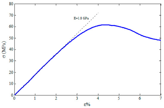 In order to determine the Young’s modulus of the FDM 3D-printed PLA materials, a uniaxial tensile test was conducted using a Hounsfield-H25KS testing machine. The temperature was kept constant at 23 °C and the strain rate was set at 0.001/s to ensure that the test condition was quasi-static loading. The tensile mechanical bench machine and a specimen under test are shown in Figure 4. The stress–strain (σ-ε) curve for the tensile dog-bone sample is shown in Figure 5. The specimen exhibited a linear elastic behavior, followed by yielding and plastic deformation. The approximate values of the Young’s modulus and yield stress were determined to be 1.8 GPa (the slope of the linear region) and 60 MPa, respectively, followed by softening irrecoverable plastic deformation.