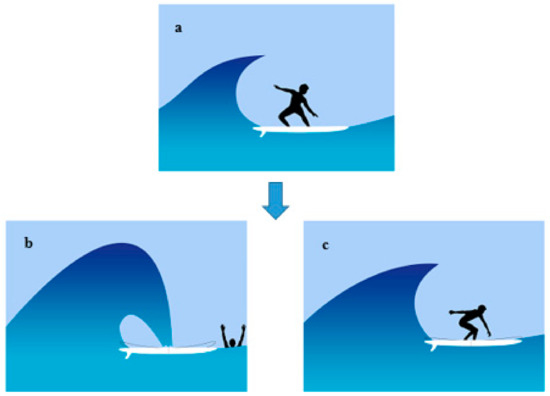 A schematic of the most common situations that boards break: (a) A standard boarding with a fine distance between the rider’s feet; (b) when the wave hits on the board while the rider falls in the water; (c) when the rider’s feet get so close together that the weight of their body is concentrated in the middle of the board.