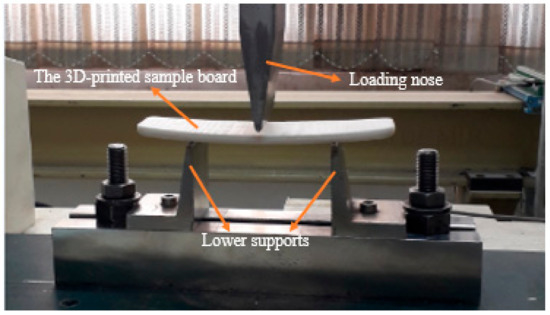 As both of these breakages are caused by bending stresses, a mechanical three-point bending test could be employed to determine the strength of the board in such loading. Stier et al. [6] also applied a similar test to their board with a novel design in shape in order to find its bending strength. The 3D-printed board with a uniform honeycomb structure in the core was tested under 3-point loading. In order to do this, the grippers of the tensile test had to be changed. The lower grip was replaced with two supports under the specimen, and the upper grip was replaced by a loading nose in the middle of the sample in order to apply force. Figure 8 shows the sample board under the three-point bending test. The test with the strain rate of 0.001 s−1 was carried out at room temperature with an 80 mm distance between two supports. A displacement-controlled test was conducted to get a maximum deflection of 4 mm in the elastic range.