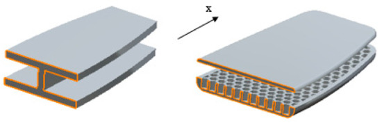 In this section, a geometrically linear simple approach for the analytical solution is provided to validate the experimental bending results of the 3D-printed board with a uniform honeycomb core structure. For this purpose, an equivalent I-shaped section, in which its geometrical stiffness varies along the x-direction, was considered to simulate the board structure, as illustrated in Figure 9.