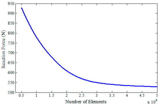 Next, in order to validate the FEM model, the designed board with a uniform honeycomb core structure under a three-point bending test was simulated. In this regard, element type C3D10M was exploited for both solid parts with approximately 37,000 elements and 2719 faces for the bottom part and 4000 elements for the top shell. To ensure the accuracy of the numerical results, a mesh sensitivity analysis was performed. In Figure 11, the reaction force of the loading nose for a maximum of 4 mm deflection was plotted versus the number of elements. It can be seen that after increasing the number of elements to >35,000, the reaction force values converge in an almost constant manner.