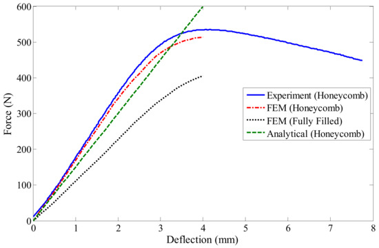 Comparison of the experimental, numerical, and analytical load–deflection curves for the three-point bending test of the honeycomb and fully-filled boards.