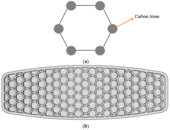 There are several allotropes of carbon such as graphite, diamond, graphene, and carbon nanotubes. As illustrated in Figure 17a, in all of the noted carbon allotropes, carbon atoms (marked by black circles) are placed in vertices of regularly patterned hexagons. Inspired by this broad usage of carbon in nature, the arrangement of the carbon atoms in the edges of a hexagon was applied to the design of the core of the board. Figure 17b demonstrates the designed board where the small circles are the carbon atoms linked together by the sides of the hexagon.